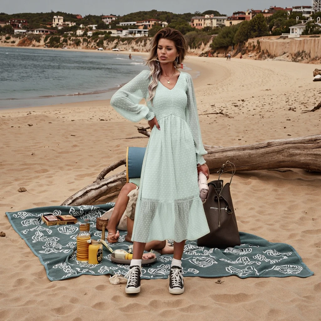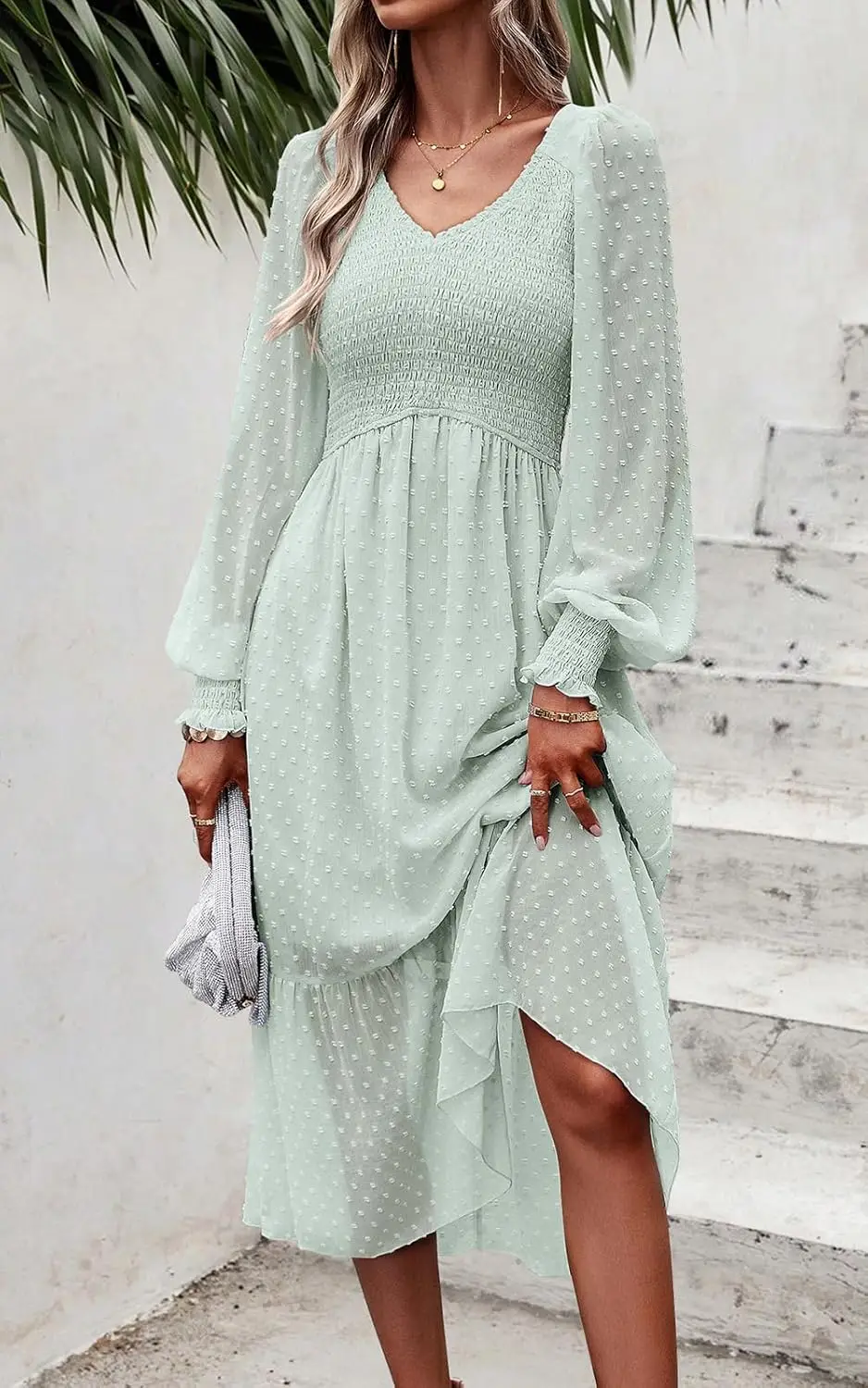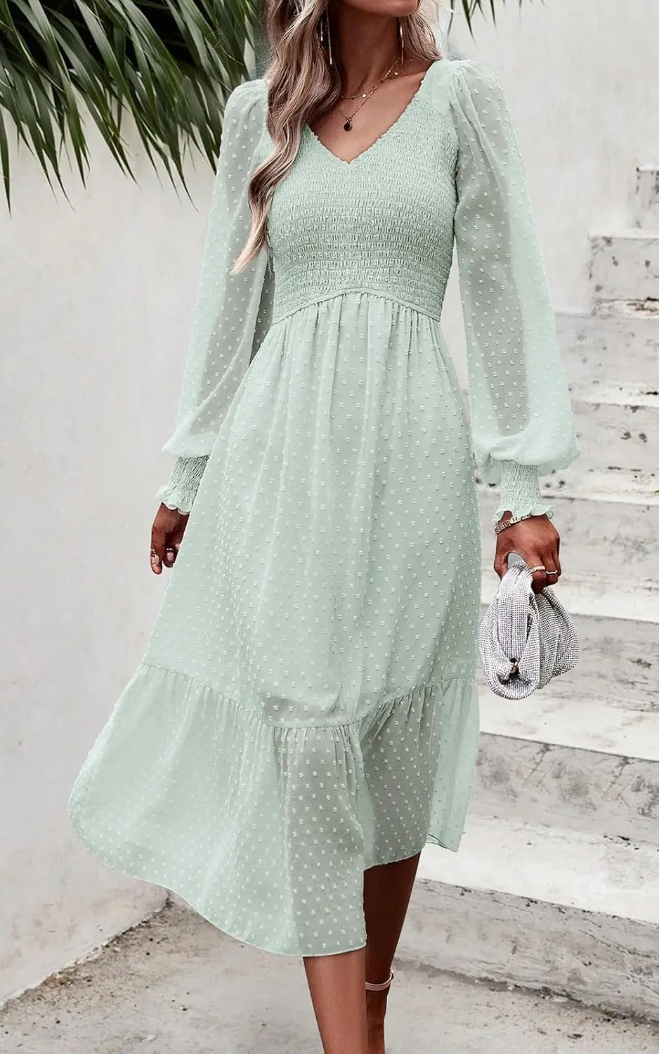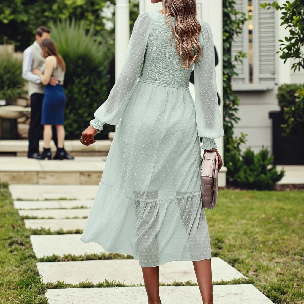 PRETTYGARDEN 2025 Women's Spring Midi Dress Long Sleeve Neck Washable for Swiss Dot Empire Waist Chiffon Ruffle Smocked Solid Pl
